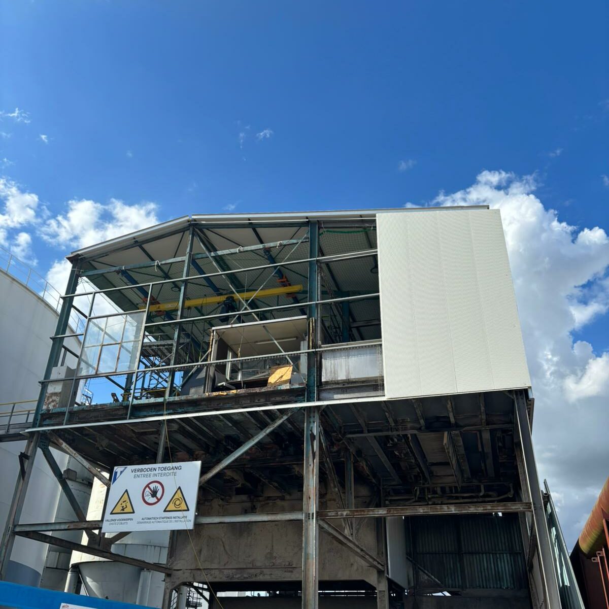 Deze verouderde bekleding werd zorgvuldig gedemonteerd en vervangen door nieuwe sandwichpanelen. Zo zijn de filterpersen in dit gebouw opnieuw optimaal beschermd tegen weer en wind.