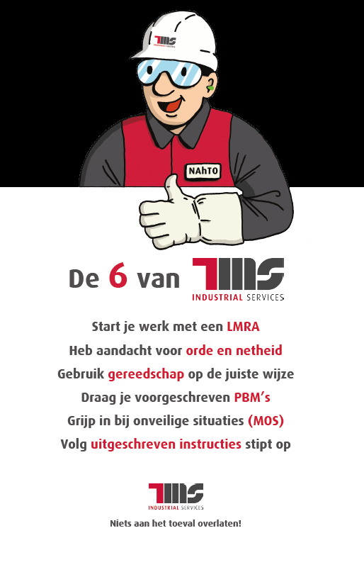 TMS Industrial Services draagt veiligheid hoog in het vaandel. We ontwikkelden hiervoor zelfs een mascotte, NahTO (Niets aan het toeval overlaten!), die het uithangbord is in al onze veiligheidscommunicatie.